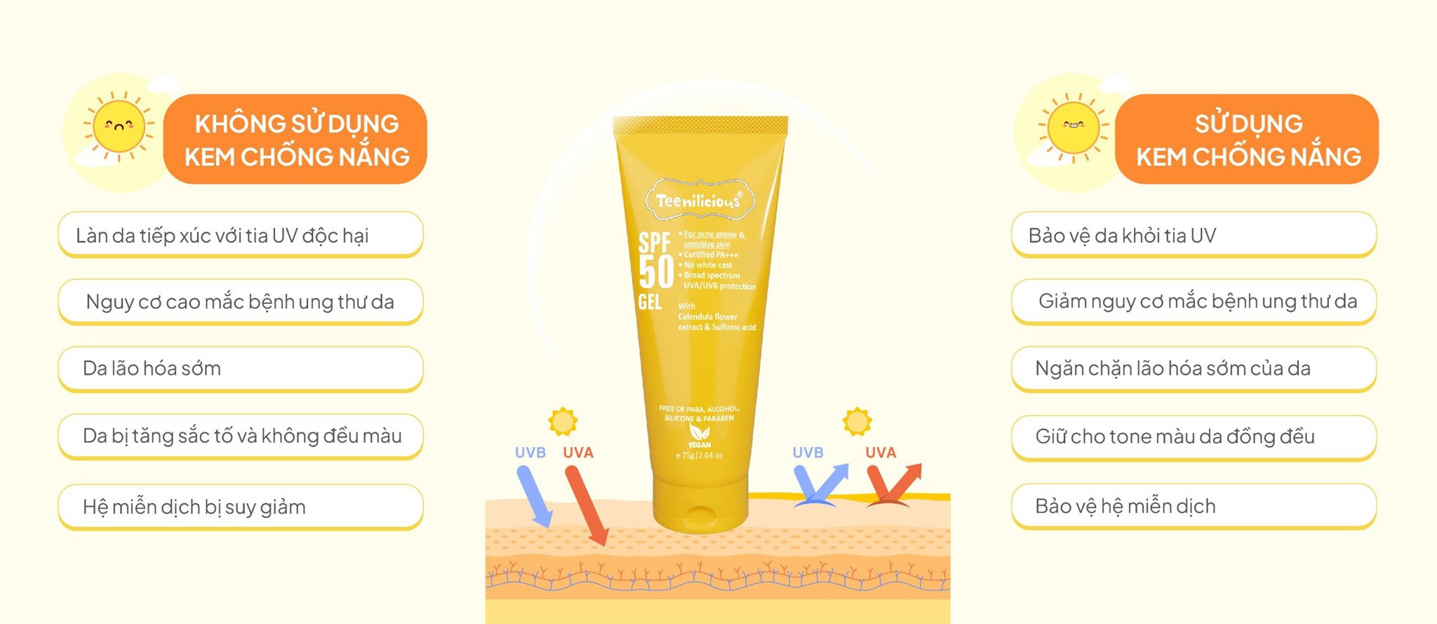 Kem Chống Nắng Teenilicious SPF 50 PA+++ Gel dành cho da mặt là một công thức bảo vệ phổ rộng giúp bảo vệ da khỏi tia UVA, UVB và hỗ trợ chống oxy hóa. Chất kem mềm mịn dịu nhẹ cho da và không làm bít tắc lỗ chân lông, phù hợp với mọi loại da, kể cả da nhạy cảm nhờ tính năng giữ ẩm tốt, giúp hỗ trợ kiểm soát dầu nhờn.