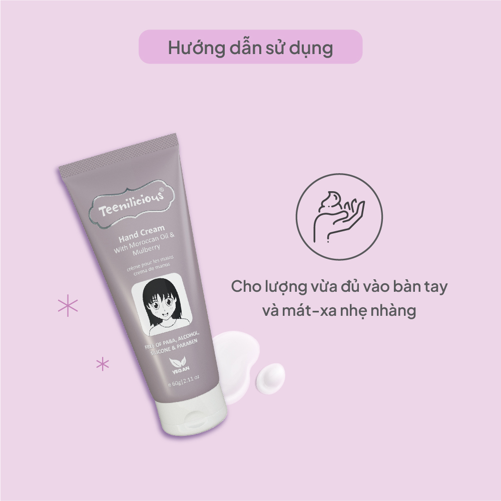 Da tay – nơi thường bị lãng quên nhưng lại là một trong những khu vực dễ bị lão hóa sớm nhất. Tiếp xúc thường xuyên với ánh nắng, khí hậu khô hanh và các yếu tố môi trường khác có thể khiến da tay trở nên khô ráp, mất độ đàn hồi và xuất hiện nếp nhăn sớm. Chính vì vậy, hãy dành thời gian yêu thương và chăm sóc cho đôi bàn tay của bạn với kem dưỡng da tay Teenelicious Hand Cream Moroccan Oil and Mulberry!