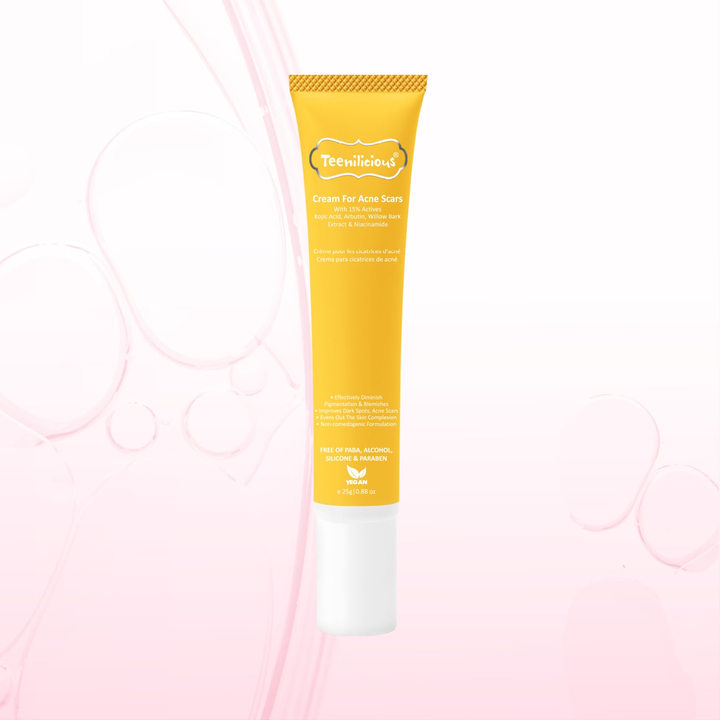 Teenilicious Cream For Acne Scars là giải pháp chăm sóc da sau mụn, giúp làm mờ sẹo mụn và vết thâm, hỗ trợ làm sạch tế bào chết và thông thoáng lỗ chân lông – những yếu tố quan trọng giúp hạn chế mụn quay trở lại. Sản phẩm giúp mang lại làn da sáng mịn, đều màu hơn theo thời gian. Phù hợp cho làn da mụn, da nhạy cảm và dễ để lại sẹo.