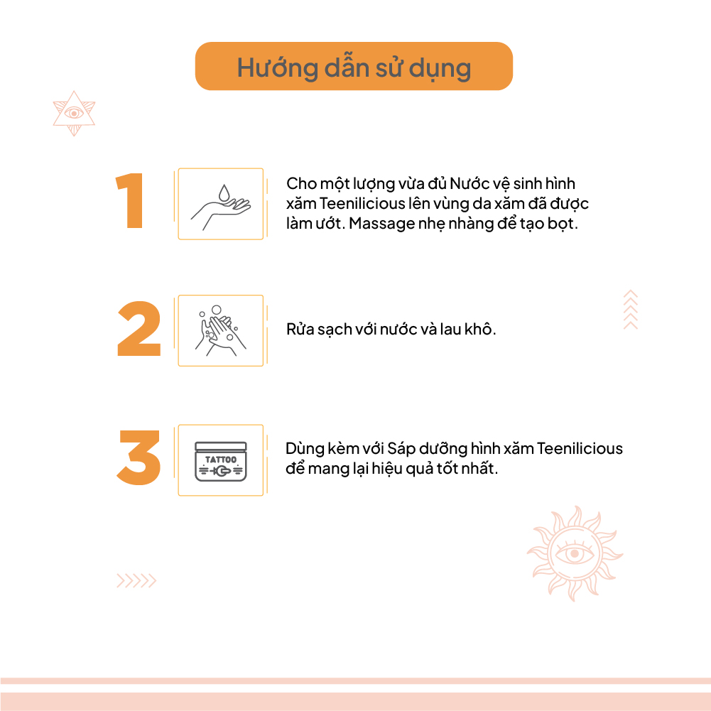 Bước 3. Rửa sạch và lau khô, dùng kèm với kem dưỡng hình xăm Teenilicious để mang lại hiệu quả tốt nhất.