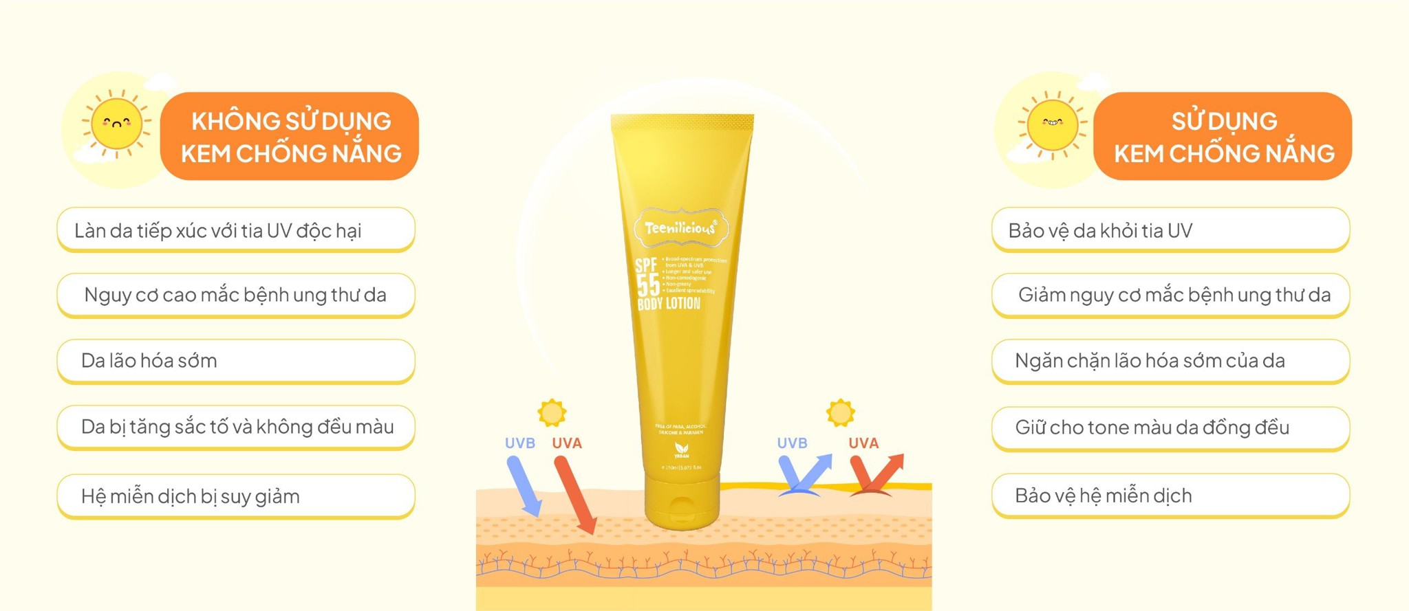 Sữa Dưỡng Thể Chống Nắng Teenilicious SPF 55 Body Lotion giúp bảo vệ làn da khỏi tác hại của tia UVA, UVB đồng thời dưỡng ẩm hiệu quả và hỗ trợ chống oxy hóa do tác động từ môi trường. Kết cấu dịu nhẹ, phù hợp với cả làn da dầu mụn và da nhạy cảm.